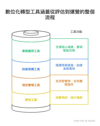 數位轉型串連系統工程時,博威顧問建立全流程偕同的工具分出四大類,包含「評估—實施—執行」。